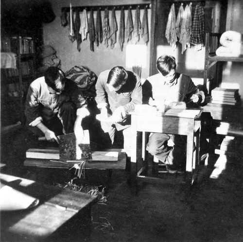 全校干部师生在校领导的带领下,大都穿着统一的灰色制服,戴草帽,与工人一道挑担、推车、锯木、植树,为了争取时间,在保证质量的前提下,师生们日夜赶工,一周建一栋房,一栋房里住120多个人,没有碧瓦朱檐,雕梁绣柱,只有木质结构的小巧房屋,上盖红瓦,外钉树皮,内铺木地板,搭起双人床,一楼多用,开会、上课、睡觉都在小木板房里。