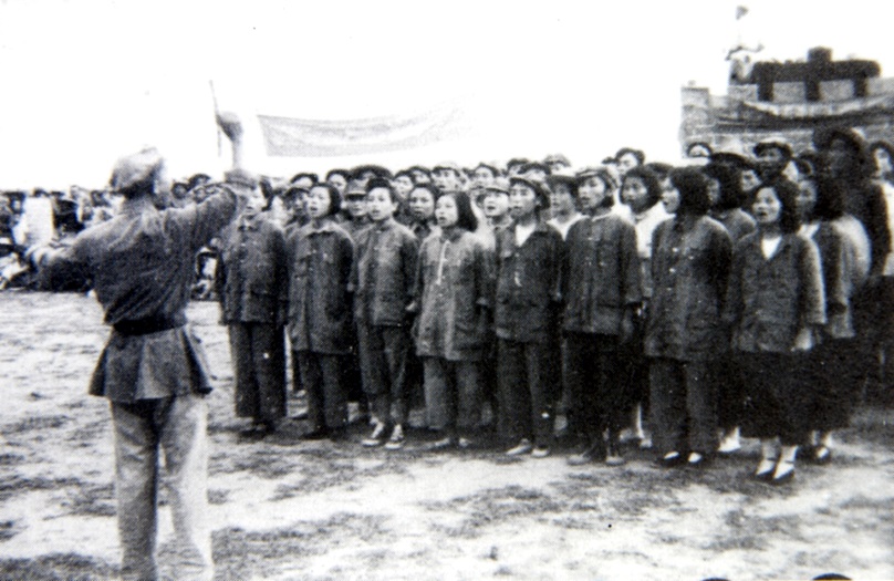中原大学青年学员在学校成立大会上引吭高歌庆祝学校成立