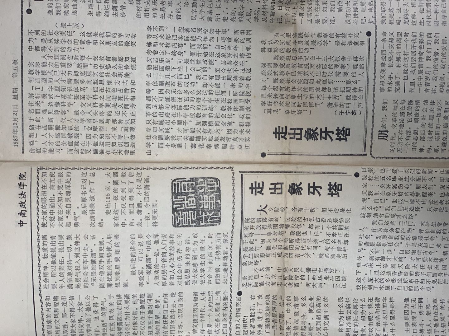 大喇叭也播过我写的小文章,记得的有两篇,同时登在当时的院报上。一篇是《天职不仅在于继承》,大意是说学校、专业都是新的,我们正好可以多些创建。另一篇是演讲比赛的稿子《走出象牙塔》,是说大学生要关心社会注重实践。这大抵也是我对学业的态度。