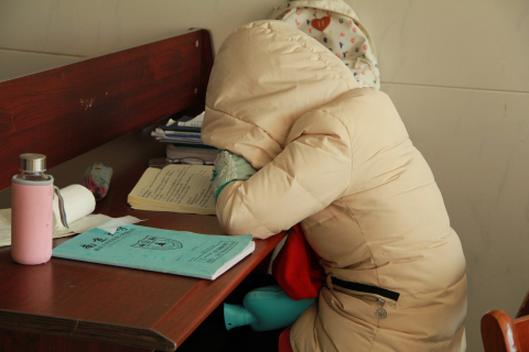 来自统计与数学学院的张怡姝捧着复习资料,时而在椅子旁来回踱步,时而蹲在椅子旁。为了能开口读而不吵到他人,她选择呆在阅览室外。为了抵御这慑人的寒冷,她选择往水瓶里倒满热水,不时地握一握它,暖和暖和因为捧书而冻到发白的手。“不到最后一刻,不会放弃”简单却又不平凡的字眼,正是她的考研态度。