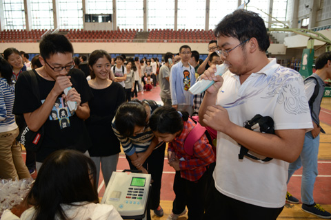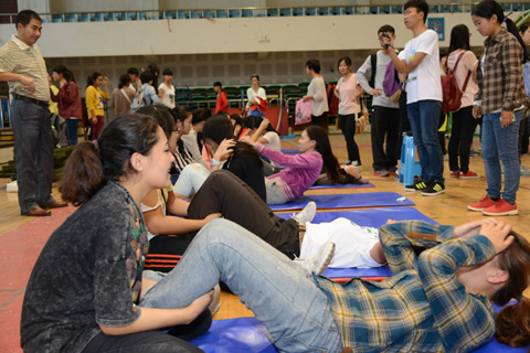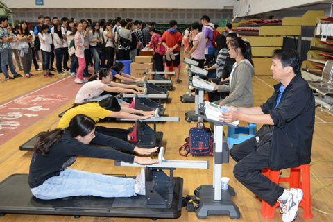 新闻网讯(通讯员 肖杰 学生记者 李瑾 高嘉佳)9月18日,我校2014年全国学生体能测试工作在南湖校区中区体育馆、西田径场启动。参加本轮测试的本科生共计2万多人,覆盖全校所有学院。18日下午,金融学院近2000名学生在南湖体育馆进行了立定跳远、坐位体前屈等9项测试。根据军训的安排,南湖校区和首义校区的大一新生会分别于10月9日和12日进行体测。因其它原因未能按时参加此次体测的学生将在10月16日在南湖校区统一进行补测。 国家学生体质测试新标准刚刚出台并于今秋开始实行。在全国大学生体质健康水平连续多年下滑的形势下,国务院、教育部下大力气来抓这项工作,出台一系列文件,强调了学生测试成绩评定达到良好及以上者,方可参加评优与评奖;成绩达到优秀者,方可获体育奖学分。测试成绩评定不及格者,在本学年度准予补测一次,补测仍不及格,则学年成绩评定为不及格。学生毕业时,《标准》测试的成绩达不到50分者按结业或肄业处理等政策。采访中,金融学院的韦同学表示,平时也更加积极地参加体育锻炼,并以此来加强自身身体素质。