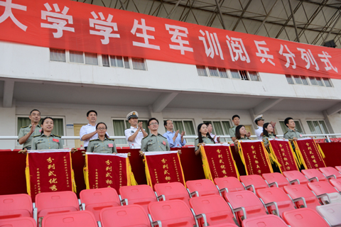 盛大而精彩的分列式随后展开,伴随着现场解说员热情洋溢的介绍,各个方阵迈着整齐的步伐,喊着嘹亮的口号,以报效祖国的激情和一往无前的气势从主席台前昂首走过,接受学校领导、老师和教官们的检阅。他们严整的军容、挺拔的英姿,矫健而坚定的步伐,饱满的精神状态,充分展现出2014级新生高昂的斗志和良好的精神风貌。 阅兵结束后,校长助理邹秉国宣读了2014级学生军训表彰决定,对全体参训人员取得的成绩给予充分肯定。校领导分别为优秀连队、优秀分列式方队、标兵分列式方队以及优秀表演方队等军训先进集体和个人颁发锦旗。