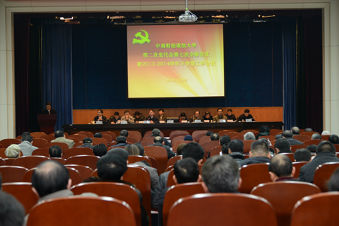 校党委书记张中华在会上作2013年党委工作报告。报告指出,2013年学校党委以“学习贯彻十八大、争创发展新业绩”为工作主线,以创建学习型、服务型、创新型党组织为目标,紧密围绕学校改革发展中心任务,不断完善思想建设、组织建设、作风建设、制度建设和反腐倡廉建设“五位一体”的党建工作格局,着力促进学校各项事业发展,取得了以下新的成绩:一是思想理论建设取得新进展;二是群众路线教育实践活动初见成效;三是组织制度建设重在实效;四是干部培养选拔规范有序;五是党风廉政建设常抓不懈;六是安全稳定工作平稳有序;七是各项事业发展再创佳绩,“文澜工程”全面铺开、人才培养积极创新、学科建设谋求转型、科学研究彰显优势、文化建设再谱新篇、内部治理逐步优化、民生建设进展顺利。