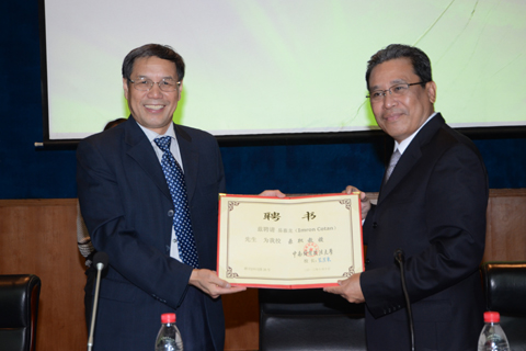 吴汉东在会上致辞,他对易慕龙进行了详细的介绍,易慕龙曾在多个国际论坛发表重要言论,在国际场合享有崇高的声誉,有着重要的影响,是印尼资深的外交家和政治家。吴汉东提出,能够成功聘请易慕龙大使作兼职教授,是我校的一大殊荣。在谈及“印度尼西亚之家”奖学金的由来时,吴汉东强调,中印尼关系友好发展,两国在经贸、文化、教育等方面的合作不断加强,为促进两国的相互了解,经印尼政府授权,印尼商务联络部在中国设立了“印度尼西亚之家”。我校著名校友黄柏先生作为“印度尼西亚之家”理事会主席,致力于推动中印之间的友好交流,并向我校捐赠1000万元人民币,设立“印度尼西亚之家”奖学金,旨在解决学生的生活困难,鼓励学生积极参加国家学术活动和社会活动,提高综合素质,增长见识,锻炼才干。这笔奖金将用于支持我校学术科研发展,奖励品学兼优、勤奋上进的学生。发言最后,吴汉东再次对易慕龙大使为推动两国友好交往所作出的贡献以及黄柏校友为母校的无私奉献表示由衷感谢。