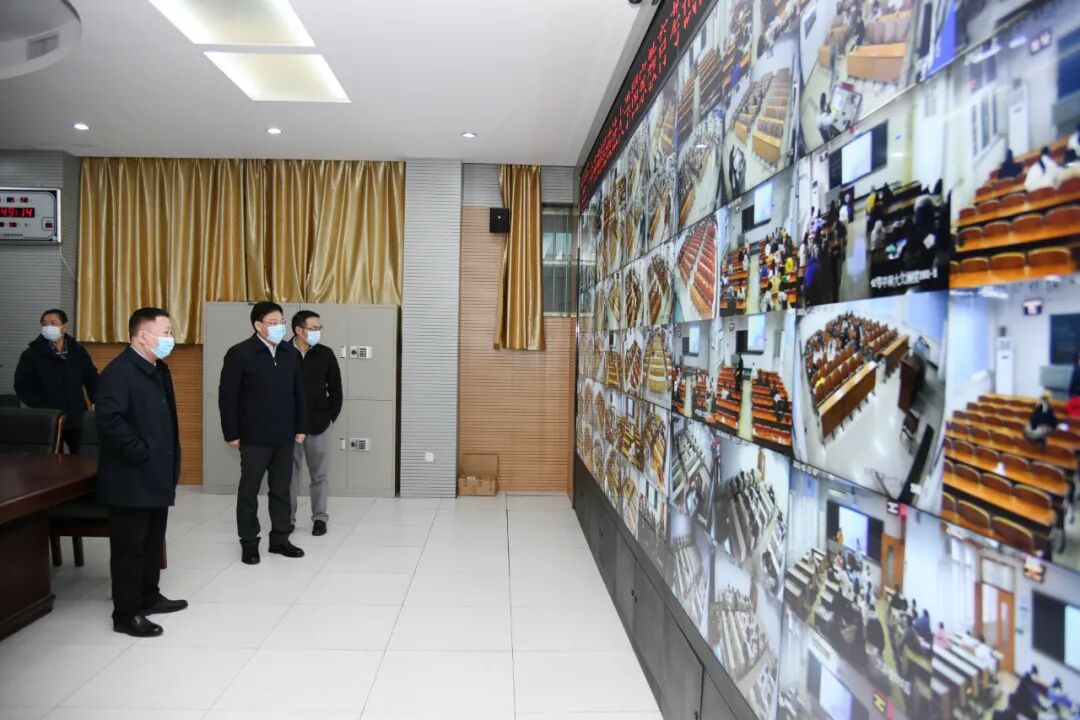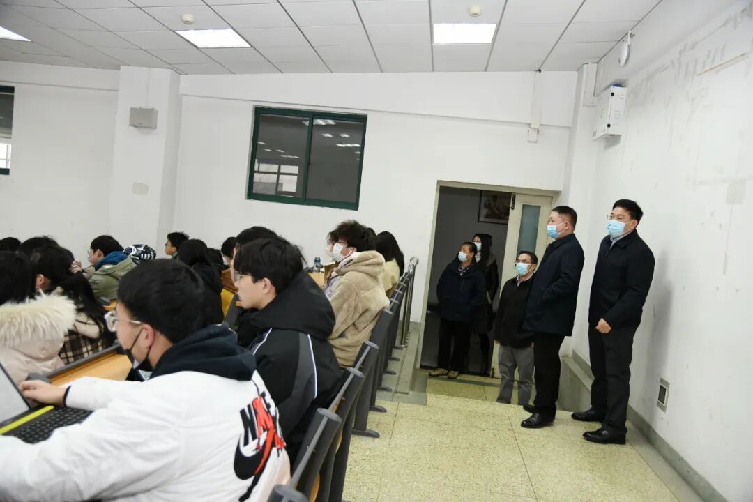 ▲校党委书记栾永玉,校党委常委、副校长姚莉一行在文添楼三楼多媒体监控室察看了研究生课堂的教学运行情况,随后深入文添楼和文澴楼课堂进行了详细检查,对教师到岗情况、学生上课出勤率及课堂秩序等实地查看。栾永玉强调,要积极主动做好疫情防控工作,精心细化课堂教学方案,完善教学规范,抓好教学质量。