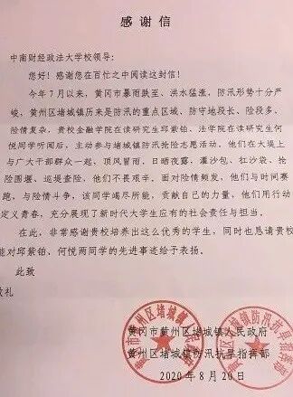 ▲右为黄冈市堵城镇人民政府来信感谢研究生邱紫铂和何悦