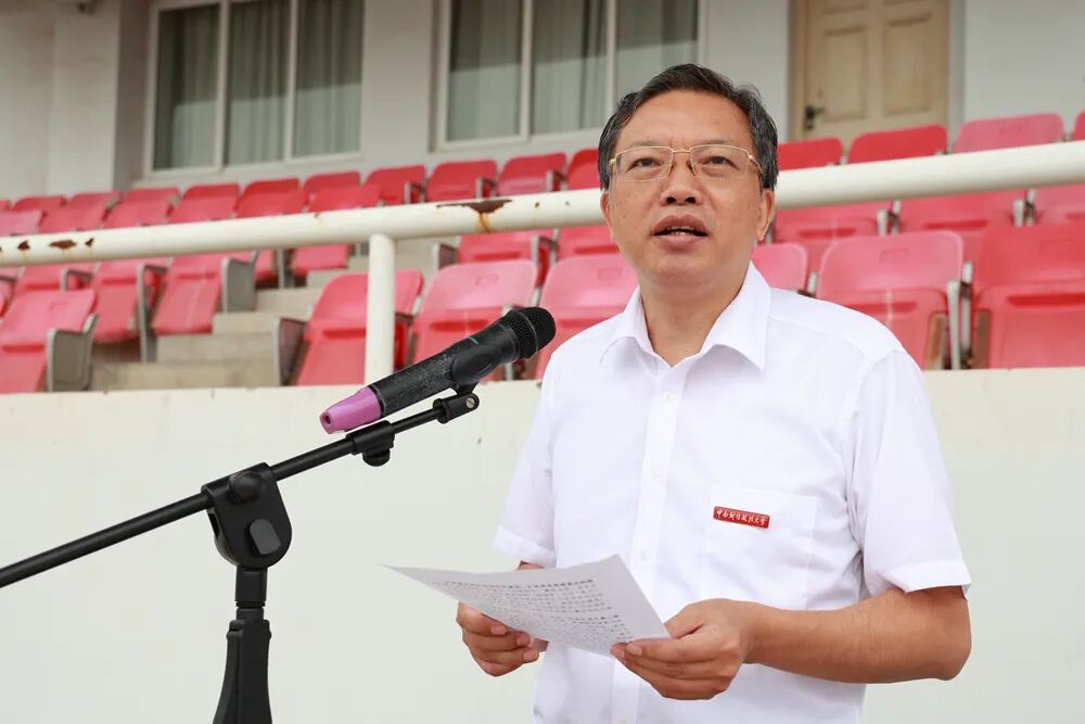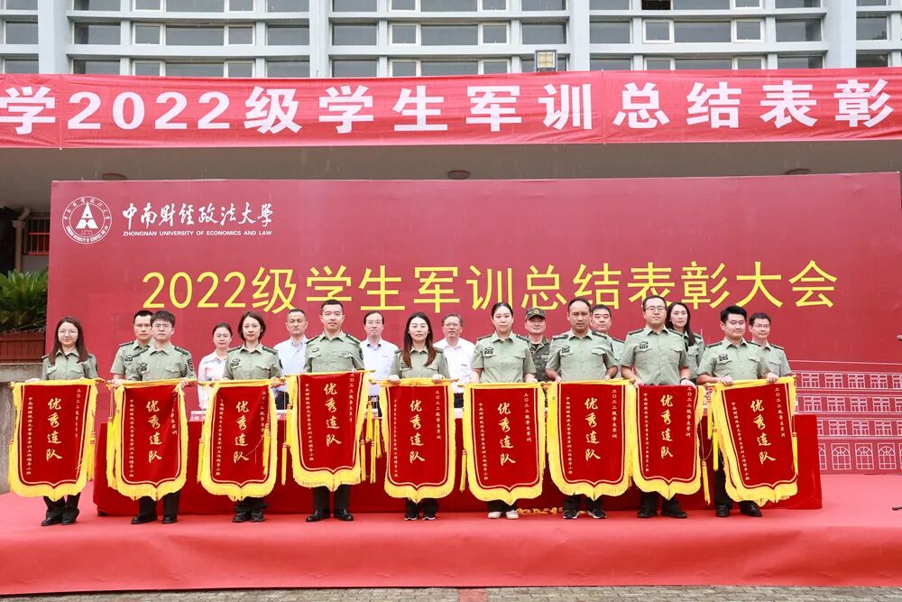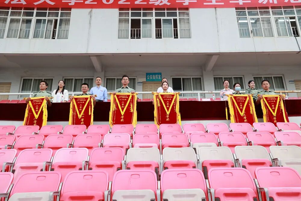 余小朋宣读《关于表彰2022级学生军训先进集体及优秀个人的决定》。全体领导分别为军训先进集体和优秀个人代表颁发锦旗,各学院带队老师代表上台领奖。