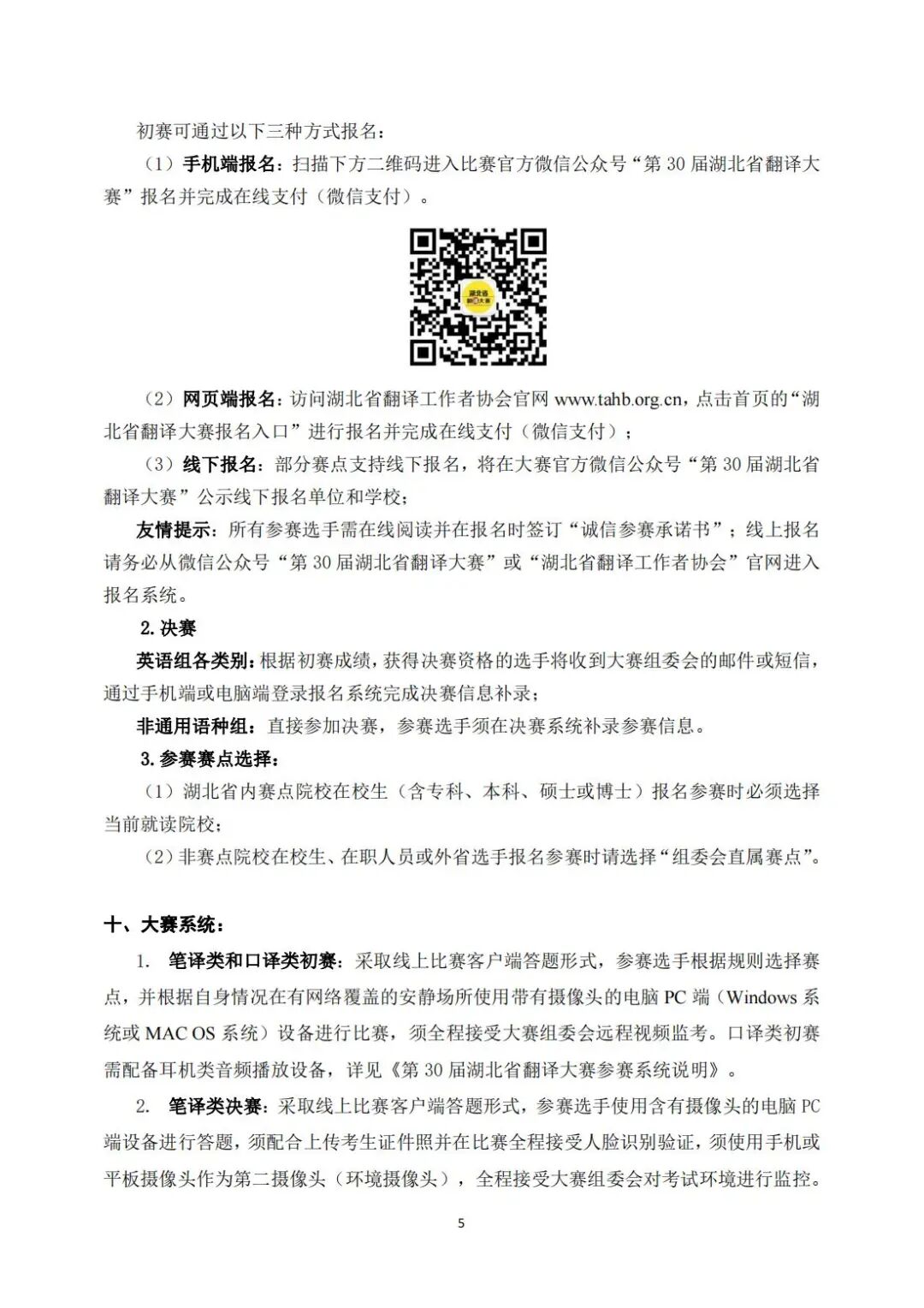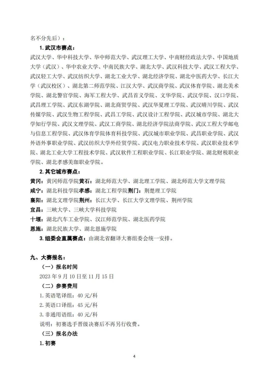 大赛初赛阶段为各赛点晋级制,决赛阶段为全省统筹制。初赛阶段赛点分布如下(排名不分先后):武汉大学、华中科技大学、华中师范大学、武汉理工大学、米兰电竞·(中国区)、中国地质大学(武汉)、华中农业大学、中南民族大学、湖北大学、武汉科技大学、武汉工程大学、武汉轻工大学、武汉纺织大学、湖北工业大学、湖北经济学院、湖北中医药大学、长江大学(武汉校区)、湖北第二师范学院、江汉大学、武汉商学院、武汉体育学院、湖北美术学院、湖北警官学院、海军工程大学、武昌首义学院、文华学院、武汉学院、汉口学院、武昌理工学院、武汉东湖学院、湖北商贸学院、武汉华夏理工学院、武汉晴川学院、武汉传媒学院、武汉生物工程学院、武昌工学院、武汉设计工程学院、武汉城市学院、湖北大学知行学院、武汉文理学院、武汉工商学院、湖北经济学院法商学院、武汉工程大学邮电与信息工程学院、武汉体育学院体育科技学院、武汉城市职业学院、武昌职业学院、武汉外语外事职业学院、武汉纺织大学外经贸学院、武汉电力职业技术学院、武汉职业技术学院、湖北工业大学工程技术学院、武汉软件工程职业学院、长江职业学院、湖北财税职业学院、湖北孝感美珈职业学院。黄石:湖北师范大学、湖北理工学院、湖北师范大学文理学院十堰:湖北汽车工业学院、汉江师范学院、湖北医药学院3.组委会直属赛点:由湖北省翻译大赛组委会统一安排。 2023 年 9 月 10 日至 11 月 15 日(1)手机端报名:扫描下方二维码进入比赛官方微信公众号“第30届湖北省翻译大赛”报名并完成在线支付(微信支付)。