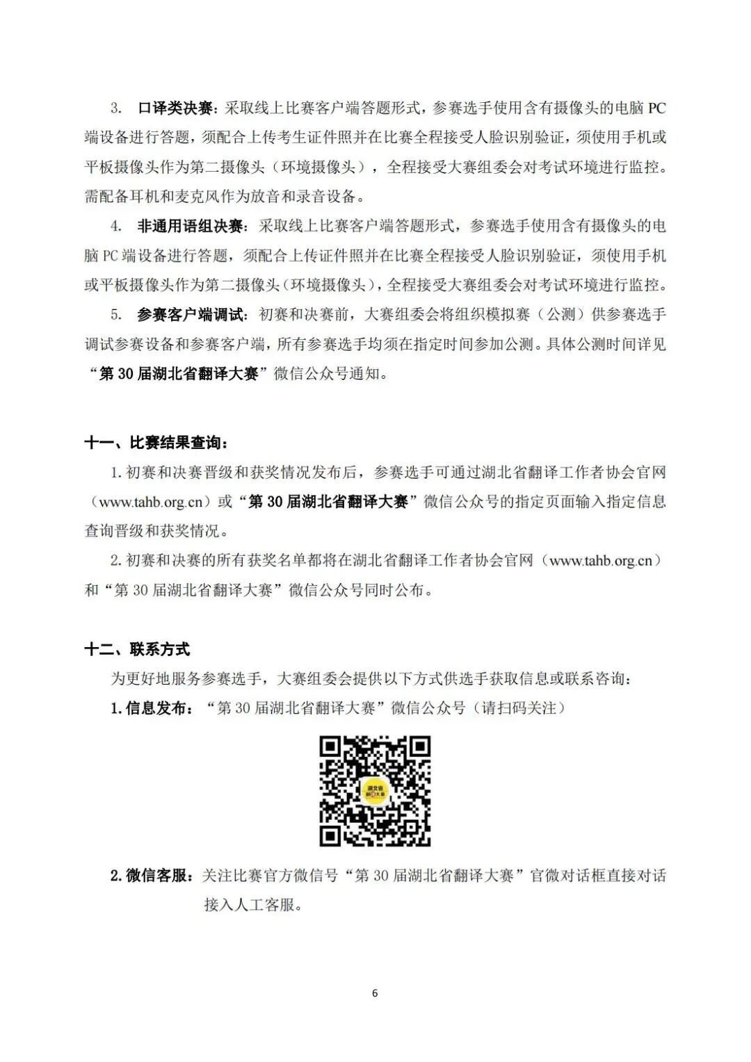 为更好地服务参赛选手,大赛组委会提供以下方式供选手获取信息或联系咨询:1、信息发布:“第30届湖北省翻译大赛”微信公众号(请扫码关注)2、微信客服:关注比赛官方微信号“第30届湖北省翻译大赛”官微对话框直接对话接入人工客服。![]()