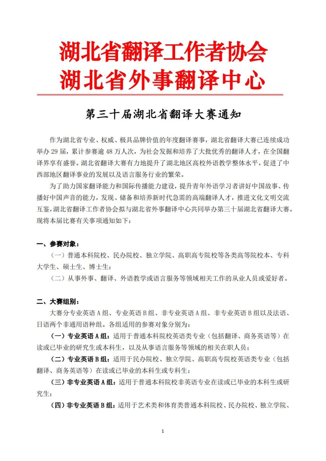 为了助力国家翻译能力和国际传播能力建设,提升青年外语学习者讲好中国故事、传播好中国声音的能力,发现、储备和培养新时代急需的高端翻译人才,推进文化文明交流互鉴,湖北省翻译工作者协会拟与湖北省外事翻译中心共同举办第三十届湖北省翻译大赛。现将本届比赛有关事项通知如下: