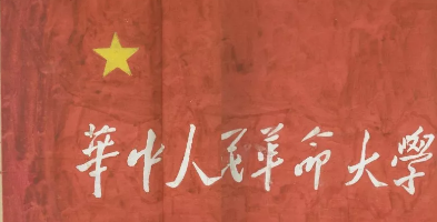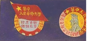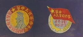 第一种是:红底,左上方为一黄色五角星,星下面一排用白色字体写就的“华中人民革命大学”校名八个大字,见下图: