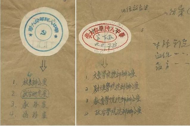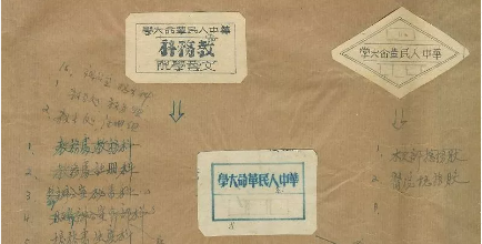 根据笔者推测,学校当时一定选定了第七征稿的第一方案作为校徽备用。但由于“华中人民革命大学”校名更换方案没有批准,因而使得这次以“华中人民革命大学”校名为设计理念的校徽也随之“流产”了。不过,第七征稿的第一方案设计图样最终得到了启用,只是将部分元素进行了调整。