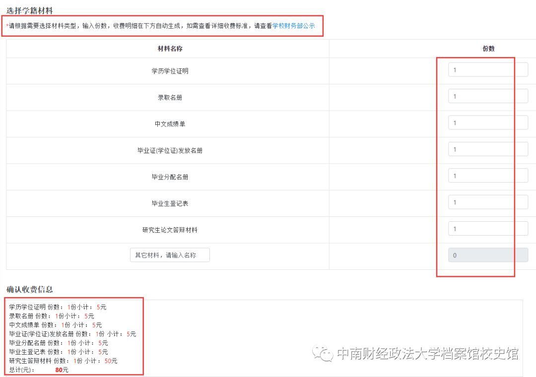 然后在选择学籍材料处根据需要选择材料类型,输入份数,可供选择的材料有:学历学位证明、录取名册、中文成绩单、毕业证(学位证)发放名册、毕业分配名册、毕业生登记表和研究生论文答辩材料以及其他材料。(收费标准可在系统中点击查看学校财务部公示。)