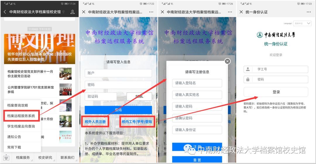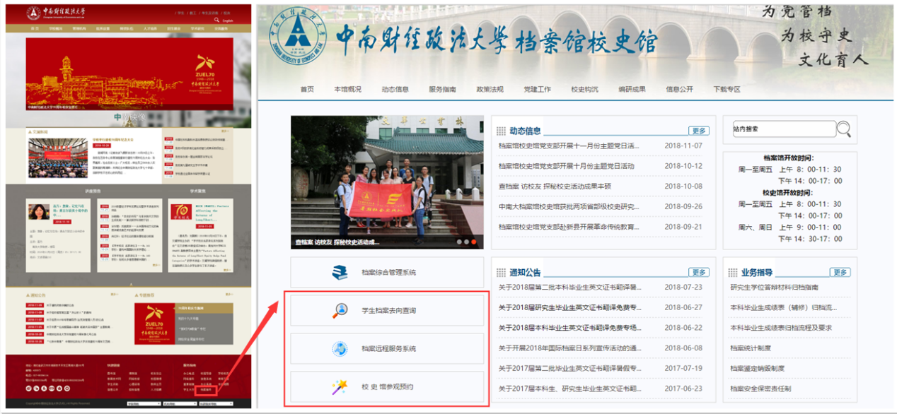 进入学校官网点击右下角“档案服务”进入档案馆校史馆官网(http://archive.zuel.edu.cn),即可根据自身需要,选择相应服务系统,办理业务。档案远程服务系统中校外人员需先注册,校内职工学生可使用工号(学号)登录。