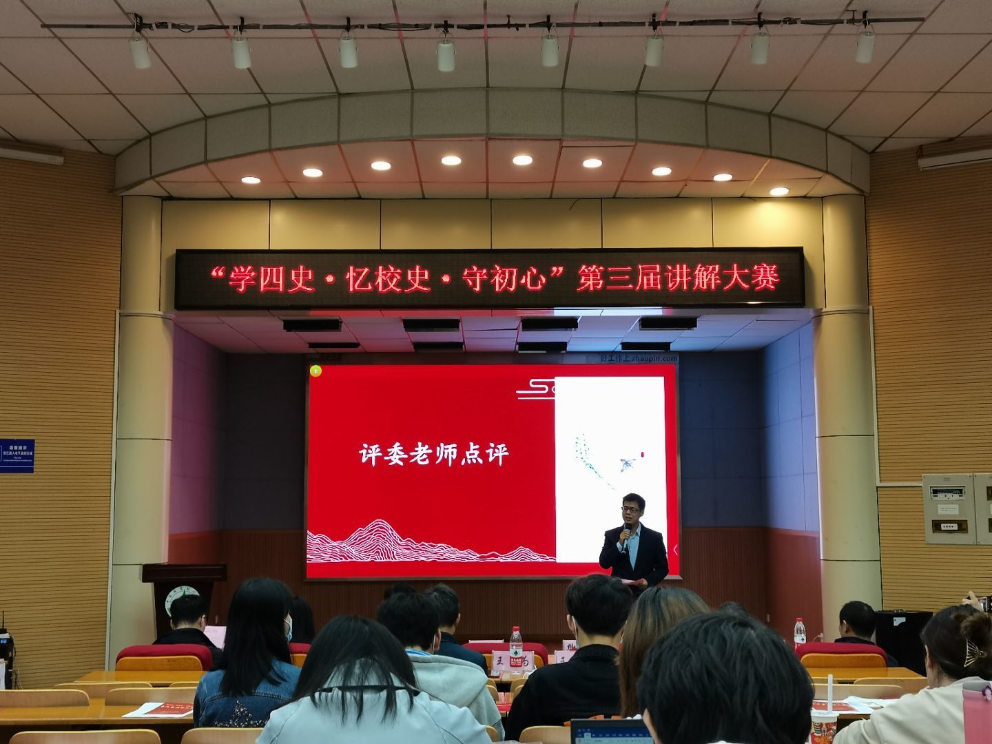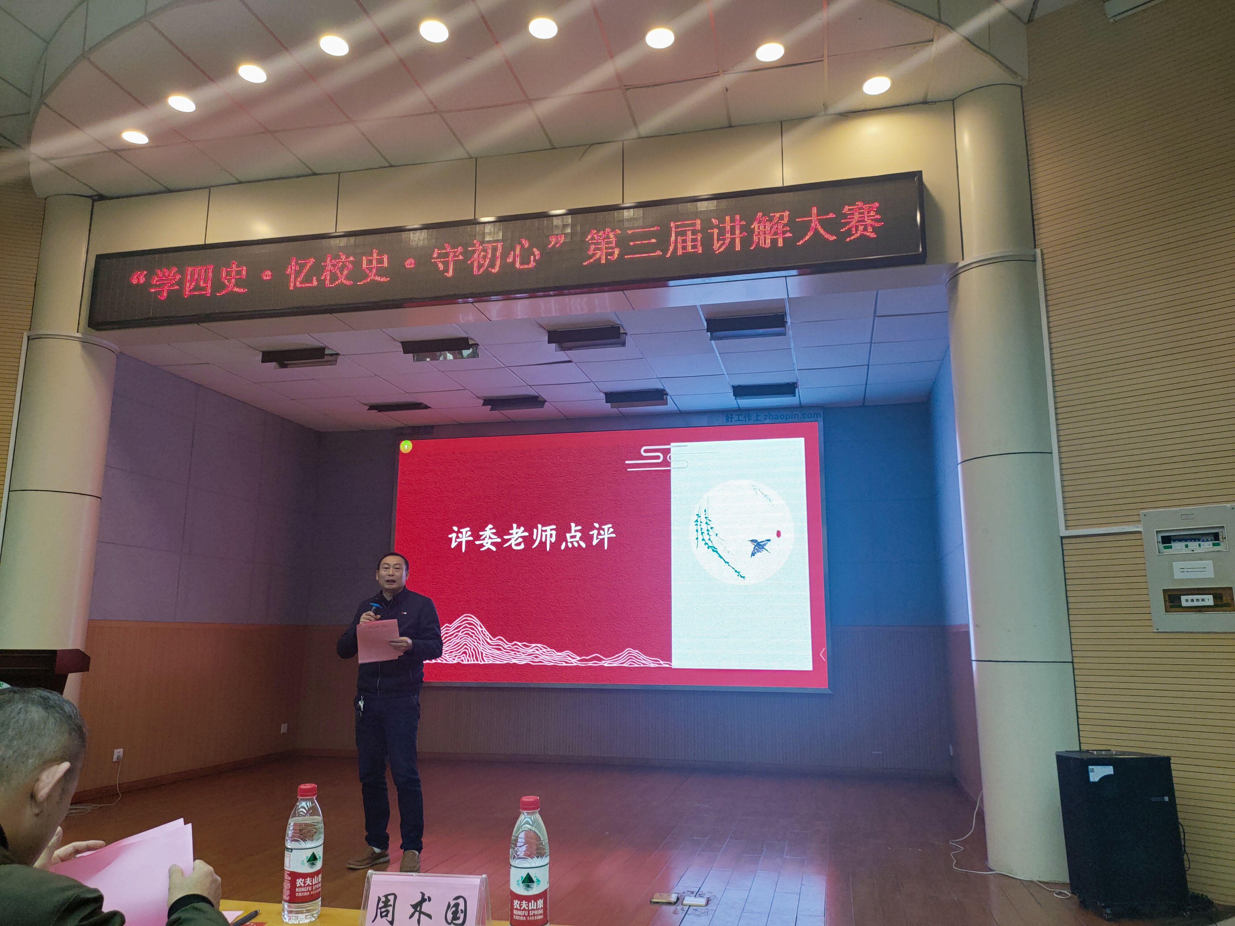 最后我校马克思主义学院周术国老师对各选手进行点评,表扬了各选手台风落落大方,尽显专业风采。周术国老师希望同学们能够借助本次机会做好四史校史学习,培养自身爱国荣校的坚定信念。