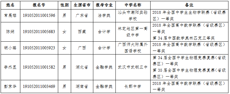 按照教育部《关于做好2019年高校自主招生工作的通知》要求和我校2019年自主招生简章规定,我校组织相关学院成立资格审查专家组,按照简章要求对报名考生进行了严格细致的审核。根据专家审核结果,确定以下5名考生获得我校2019年自主招生考核测试资格,现予以公示,公示期7个工作日。