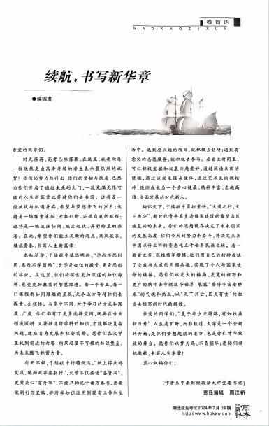 青春续航,书写华章。我校党委书记侯振发为高三考生撰写文章《续航,书写新华章》,向他们表达祝贺之余,以“续航”为关键词对他们提出了殷切期盼。该片文章还作为卷首语发表于《湖北招生考试》2024年第19期,鼓舞了湖北省的广大考生。