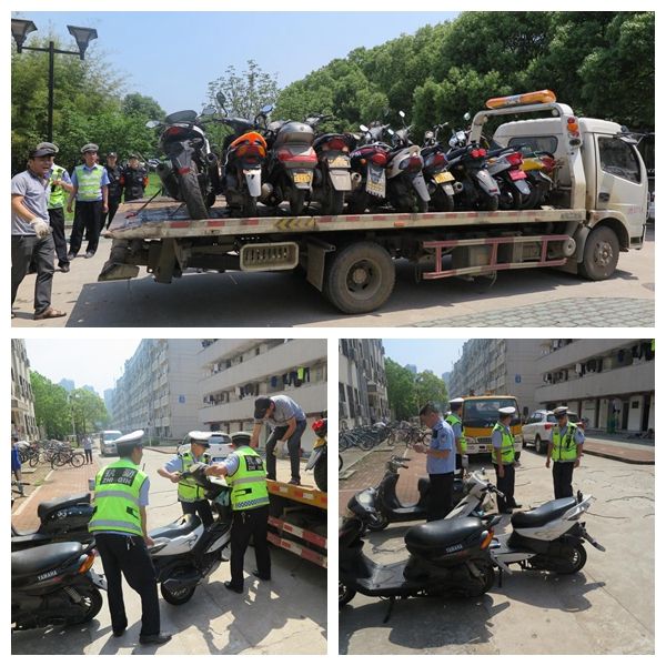 近段时间以来,校园内摩托车违法上路、高速行驶等问题,已严重扰乱学校正常教学秩序和危及行人的人身安全,特别是改装摩托车噪音扰民引起师生广泛关注。为切实加强校园道路交通管理,维护道路交通秩序,保障师生员工安全。据学校专项整治校内道路交通秩序的工作安排, 5月9日上午校保卫部配合东新开发区交警大队、铁箕山派出所,对在我校南湖校区内行驶和停放的摩托车进行了专项整治。执法交警针对未悬挂号牌摩托车,按照疑似盗抢车辆进行了暂扣。通过在校内道路及宿舍区域巡查,此次专项整治共暂扣无牌照摩托车28辆,净化了校园交通环境、规范了校园交通秩序。