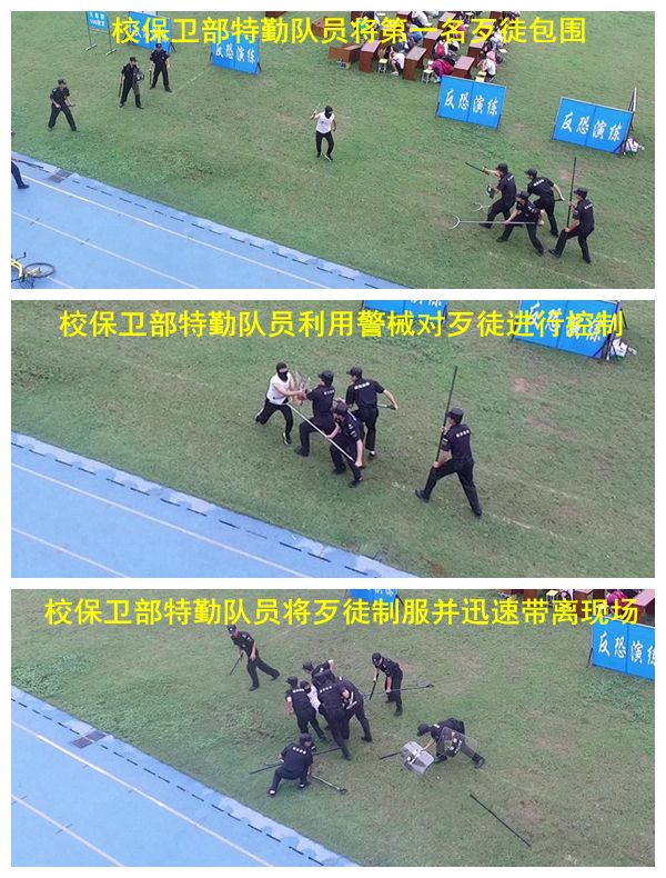 整个事件的处置过程规范、果断迅速,充分体现了学校长期以来开展安全防范教育、完善应急处置机制、加强日常安保管理、安保人员实战技能训练等各项工作的成果。活动中,学校安保队员还进行了擒敌拳、警棍盾牌操表演。