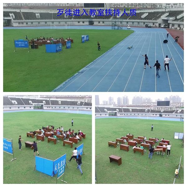 演练模拟3名歹徒闯入学校教室,砍伤1名学生后劫持2名人质,要求警方释放其被关押的同伙。学校保卫部安保人员发现警情后迅速向校110值班室报告,学校保卫部随即启动了学校突发事件应急处理预案,指挥校内第一快反处置力量按照预案分成2组赶往事发地开展工作,并立即向公安机关报警。1小组赶到现场后对教学楼内学生进行了紧急疏散,分控现场;2小组对落单的1名歹徒进行围堵,并将其当场抓获。东新公安分局接警后,迅速调度快反专业力量处置,梯队力量赶赴现场增援,对现场进行隔离控制。公安干警通过耐心地与歹徒进行周旋,现场拟定了解救人质的工作方案,在学校安保人员的配合协助下,抓获并击毙犯罪分子各1名,同时将解救的人质安全送至医院治疗,成功解除人质危机。