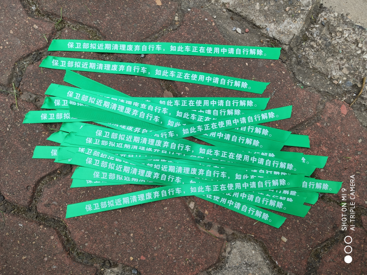 据悉,此次标记车辆分为两种,一种属于可回收车辆,绿丝带绑在后轮或左车把;一种属于报废车辆,绿丝带绑在右车把或前轮。可回收车辆将由勤工助学中心负责对其进行修理,提供学生再次使用。报废车辆将运送到指定地点,集中处理。