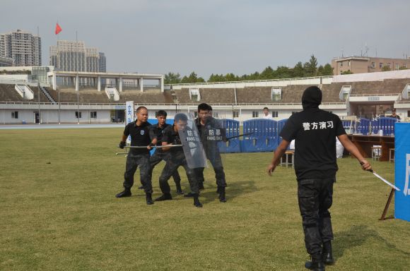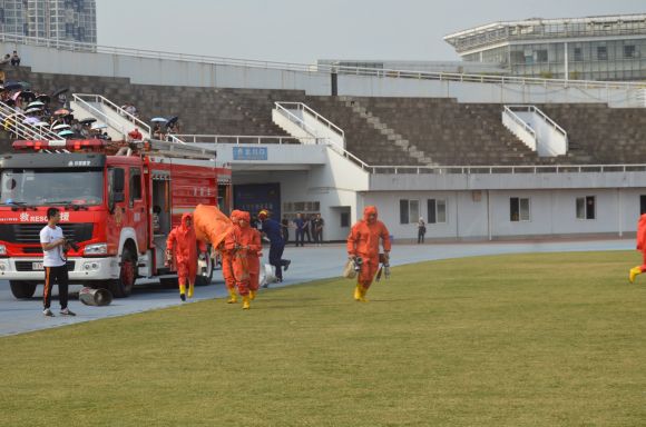 在第二部分智斗歹徒的模拟警情情节更是精彩。在模拟警情中,两名不法分子突然闯入实验室,其一胁迫老师搜寻危化品,情形危急。校保卫部人员迅速采取一键报警装置,与随即赶来的警方一同配合,前门与其搏斗,后门疏散师生,迅速构筑屏障,劝离围观群众,外围封控现场。一人落网,另一人却挟持人质、负隅顽抗。争斗之时,失去理智的歹徒打翻危化品,顿时浓烟四起。被胁迫人员趁乱出逃,歹徒终被制服。为了消除危化品的不良影响,消防队员迅速采取了相应措施,吸附棉条、吸附枕等设备轮番上阵,清理完毕。期间,掌声、惊叹声、欢呼声不绝于耳。