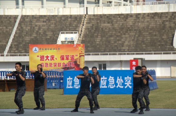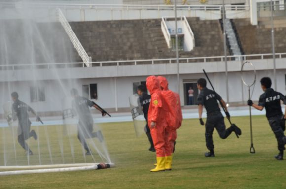 我校党委常委、副校长申祖武,东新公安分局副局长李闽,东新公安分局反恐大队、特警大队、治安大队主要负责人和铁箕山派出所、东新消防救援大队、武汉洪保保安公司等单位负责人,以及华中科技大学、华中师范大学等六所高校保卫处(部)负责人,我校学工部、后勤保障部、信息与安全工程学院等相关单位领导及2000余名师生到场观摩。