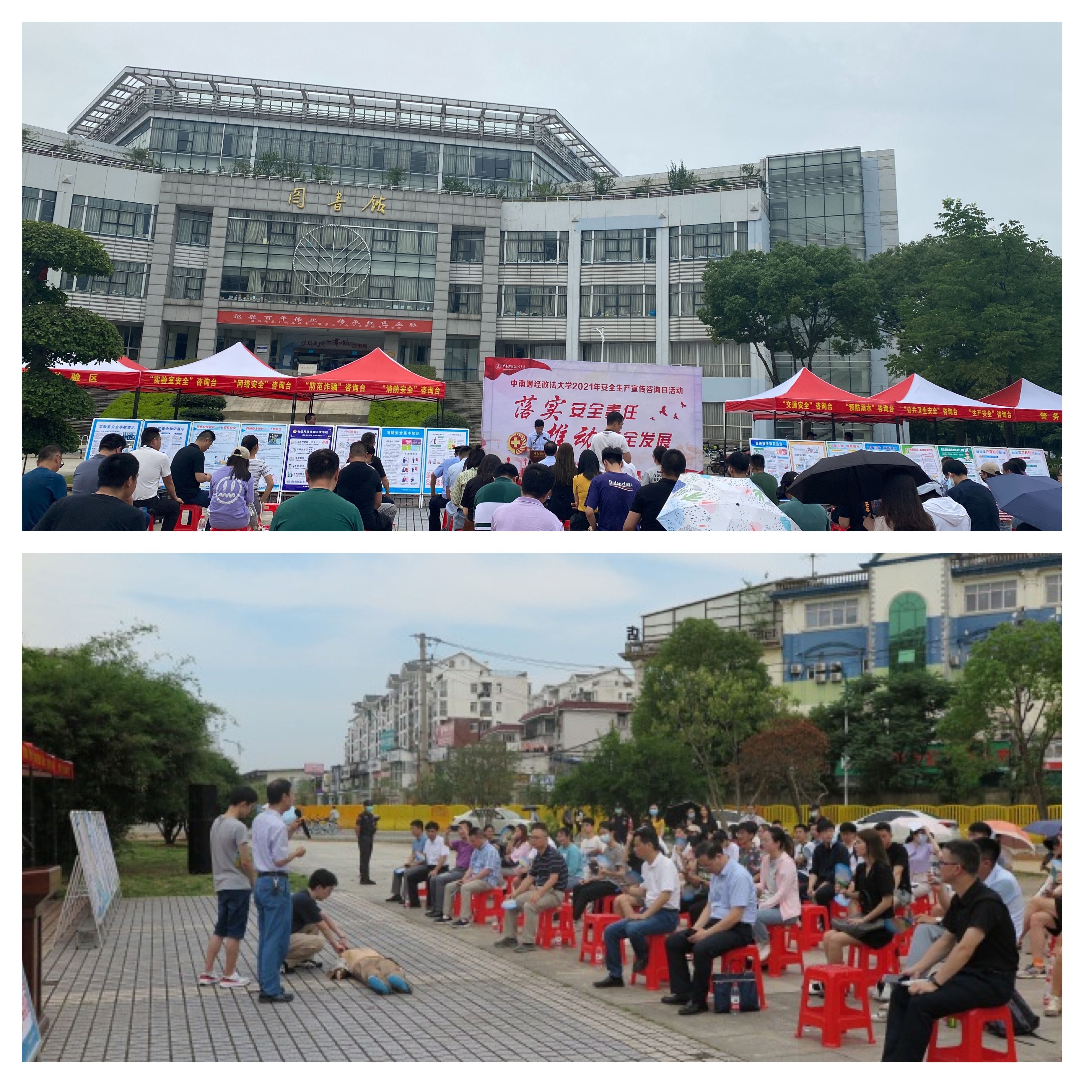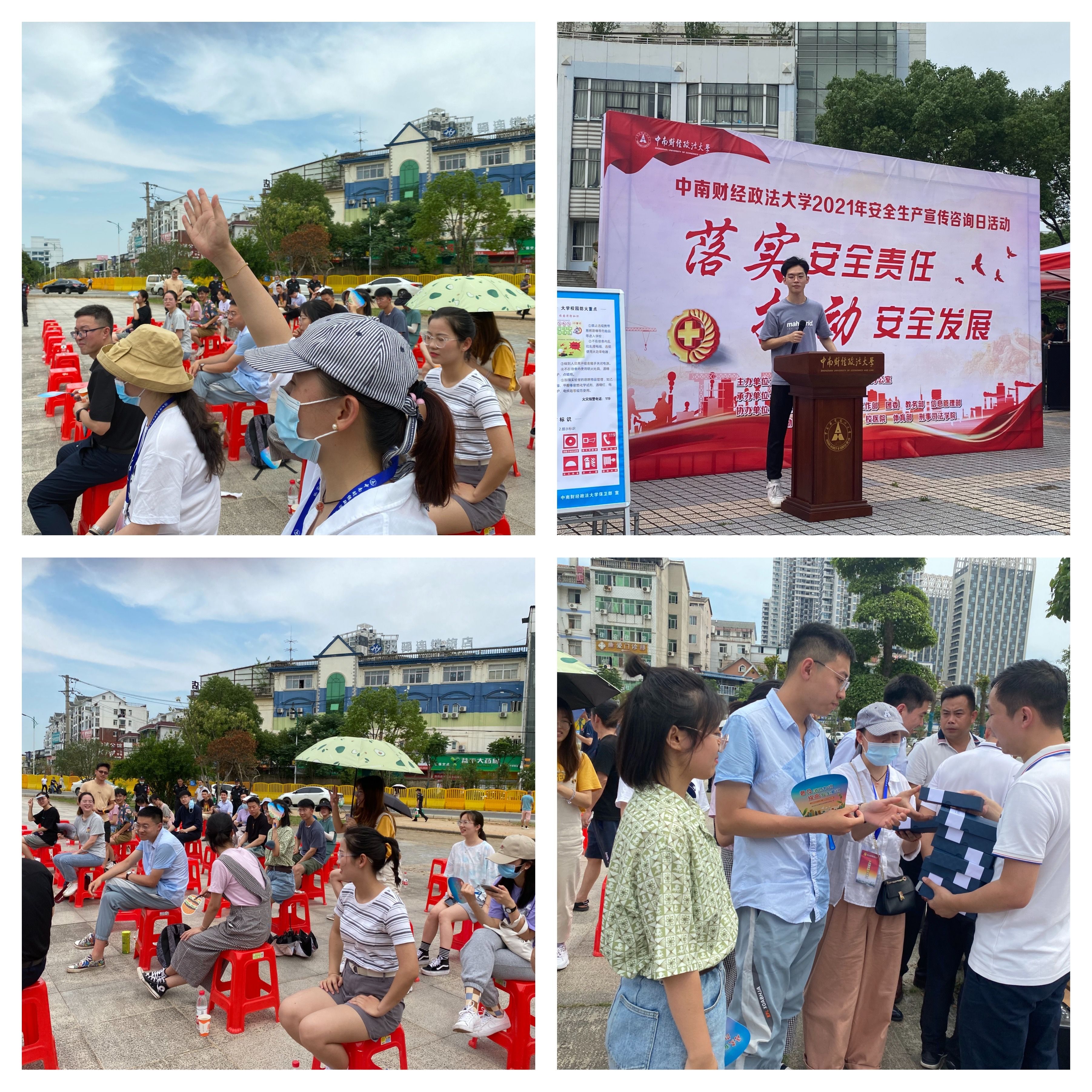 6月16日,学校办公室、保卫部会同学生工作部、党委研究生工作部、团委、教务部、信息管理部、后勤保障部、校园建设部、校医院、体育部、刑事司法学院等单位,在南湖校区五羊广场举办主题为“落实安全责任,推动安全发展”的安全生产宣传咨询日活动。校党委常委、副校长申祖武出席了本次活动。
