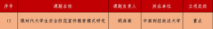 此次“高校保卫科学”研究课题申报工作于今年6月份启动,由中国高等教育学会保卫学专业委员组织,经资格审查、匿名会议评审等环节,最终在全国高校中遴选出立项课题40项,其中“重点”课题20项,“一般”课题20项,我校申报的课题“微时代大学生安全防范宣传教育模式研究”作为“重点”课题,获立项支持。