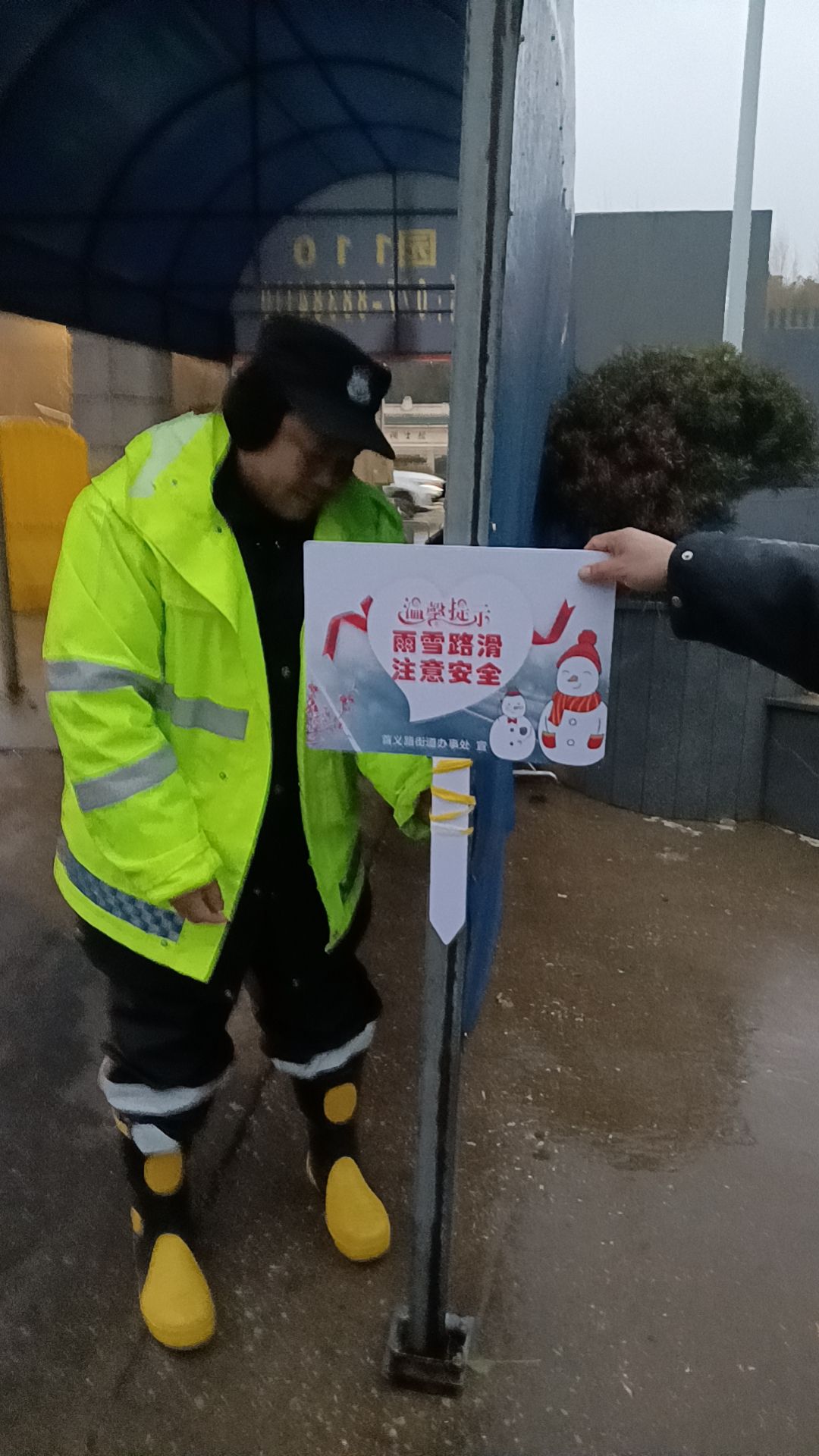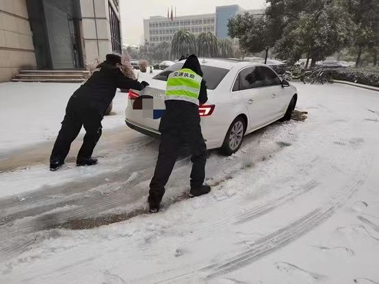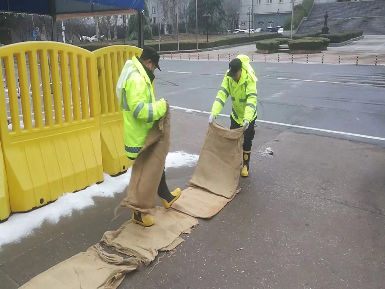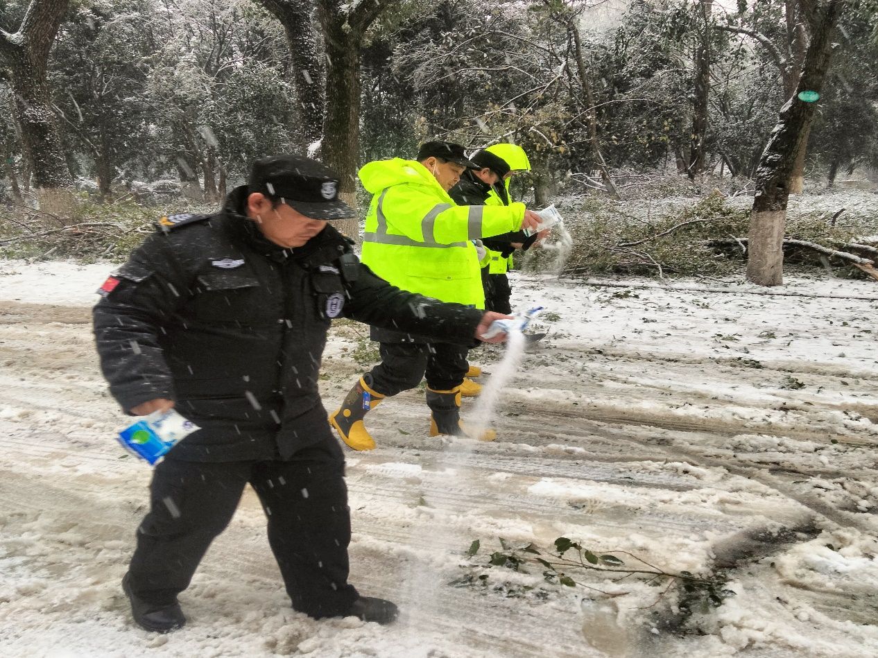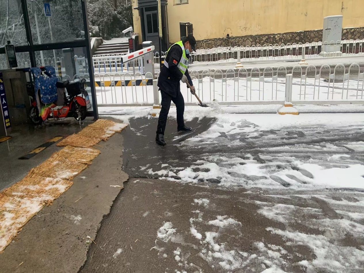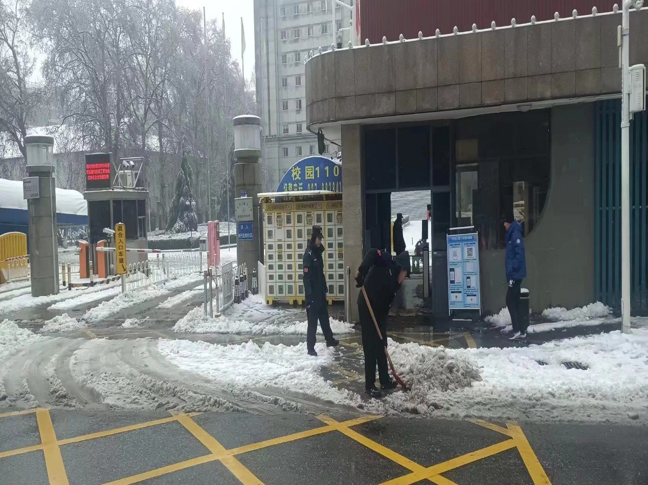 为最大限度消除雨雪天气对师生的影响,避免极端天气造成的各类次生灾害,保卫部不等不靠、主动作为,组织校卫队员迅即出动,对掉落树枝进行搬运清理,对道路积雪进行铲除清扫并撒盐融冰,在人员出入口、坡道等位置铺设防滑垫,保障师生安全出行;协助受困车辆脱困,增加巡逻频次、扩大巡逻范围,全面排查树枝断落安全隐患,并及时联系相关车主紧急迁移车辆,规避树枝砸落风险;在校园出入口等显眼位置竖立温馨提示牌,在危险区域拉设警戒线,提醒师生注意防滑且不要在树下活动,提高师生自我防护意识。