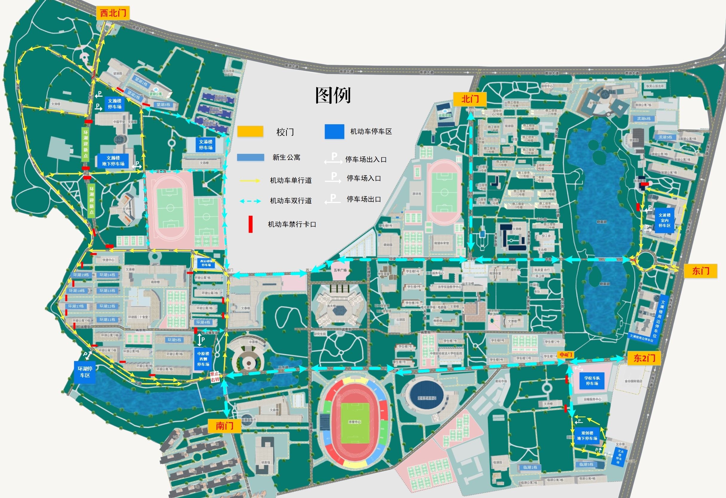 8月31日8:00至9月1日24:00,学校将对南湖校区学生公寓及周边区域进行交通管制,禁止机动车通行及停放,并将望湖片区、环湖片区、临湖片区、滨湖片区部分道路设为单向通行。同时,开放南湖校区部分校门(南湖大道一线“西北门、北门”,民族大道一线“东门、东2门”,济世路一线“南门”)和机动车停车区,方便新生报到及老生返校。(详见下图)