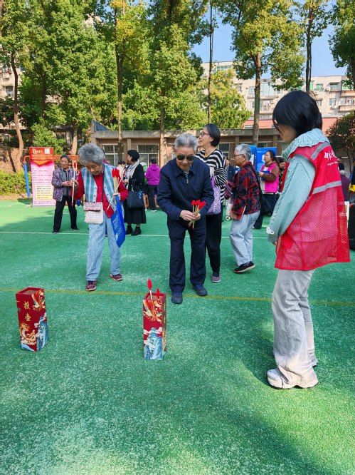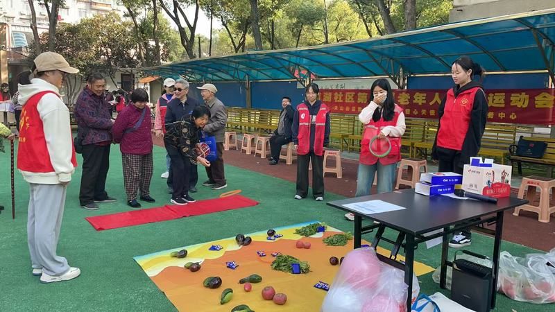 趣味运动区无疑是全场的焦点。这里既有考验平衡与耐心的“运送乒乓球”,也有需要精准技巧的“投沙包”、“投壶”和“桌上冰壶”,老朋友们瞄准、出手,场边欢呼声与掌声此起彼伏。而“赶’鸡’入笼”、“夹纸运纸大作战”等项目则充满了童真童趣,让老人们仿佛回到了童年。最受欢迎的当属“果蔬圈圈乐”,套中的蔬菜可以直接带回家,让参与者收获了双倍的喜悦。整个赛场上,没有紧张的竞技比拼,只有相互的鼓劲、默契的配合和洋溢在每个人脸上的开心笑容。