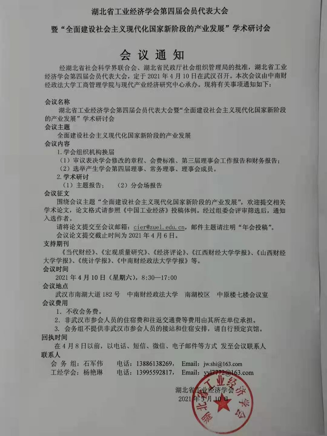 湖北省工业经济学会第四届会员代表大会暨“全面建设社会主义现代化国家新阶段的产业发展”研讨会会议通知