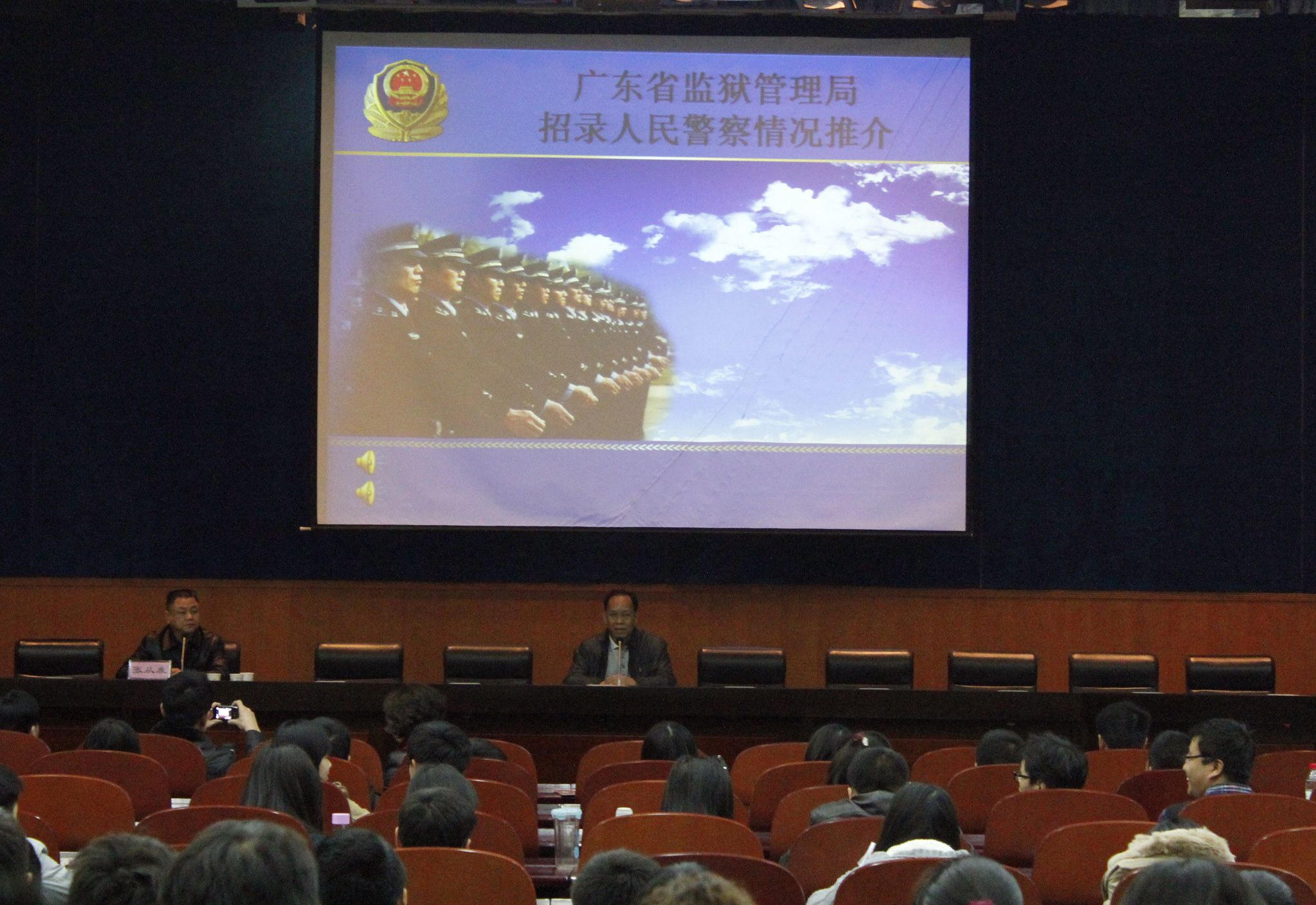 3月11日下午14时,由就业指导中心主办、刑事司法学院承办的2013年广东省监狱管理局招警宣讲会及公务员招考应试讲座在文泉楼学术报告厅召开。据悉,2013年广东省将招录公务员约3万人,人才需求量大,此次来我校进行招警宣讲是为了能够吸引更多高层次、高水平人才前往广东就业。