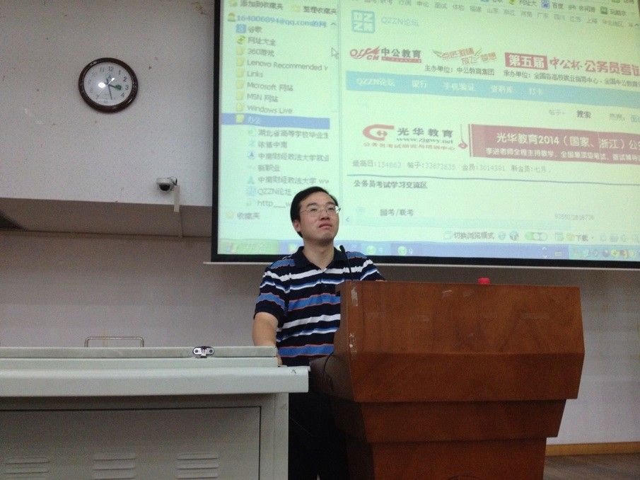 余老师首先对今年的就业形势进行了分析。由于全国乃至世界经济增长放缓,给13级毕业生就业造成了极大的困扰,同时今年的毕业生人数较往年有较大增幅,竞争更加激烈,余老师称13年为“最难就业季”。然而,另一方面随着我国经济逐渐复苏,就业岗位和招聘单位有所增加,这对我们来说是一个积极信号。余老师指出,我院13级毕业生实际就业率约为84﹪,其中通过公务员考试的占34.91﹪,进国企的占12.73﹪,考研的占19﹪。通过与法学院进行横向比较并结合我院的专业特点,他认为公务员考试是我院毕业生的主要流向,而考研、进企业次之。但余老师建议我们应该把握住各企业招聘的节奏,充分利用双学位使就业方向多元化,不做“悲催的毕剩客”。