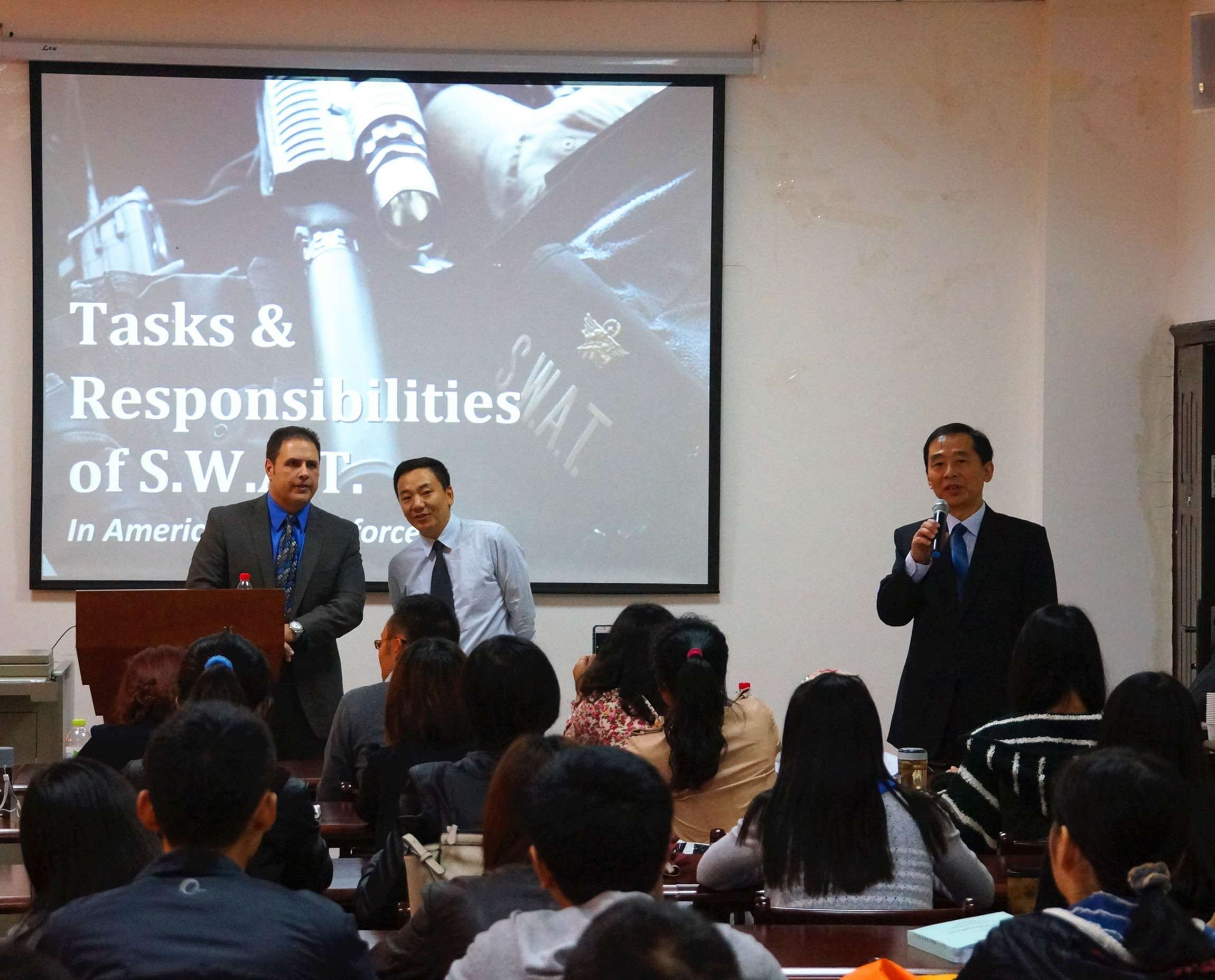 讲座伊始,Wallace先生首先向大家介绍了特警标志S.W.A.T.的含义。S.W.A.T是Special Weapons And Tactics的简称,意为“特殊武器与战术”,它在美国已成为特警的代名词。Wallace先生结合自己的实际工作经验,从清除障碍、人质解救、高风险的逮捕和搜查、保卫政要、暴乱控制、打击恐怖主义与搜查和救援活动这七个方面对特警的工作内容和责任进行了详尽讲解,并结合案例、视频逐一展开分析。通过Wallace先生的讲解,同学们了解到了美国特警的主要任务,即使用特殊武器和战术全力保护包括犯罪嫌疑人和被害人在内的全体人员的安全,了解到了特警队的组成结构以及队员们所接受的专业训练和技能培训等实务性知识。讲座提问环节时而幽默时而犀利,Wallace先生耐心地回答了每一位同学的提问,使现场的听众对美国特警及他们的工作有了更为深入的了解。