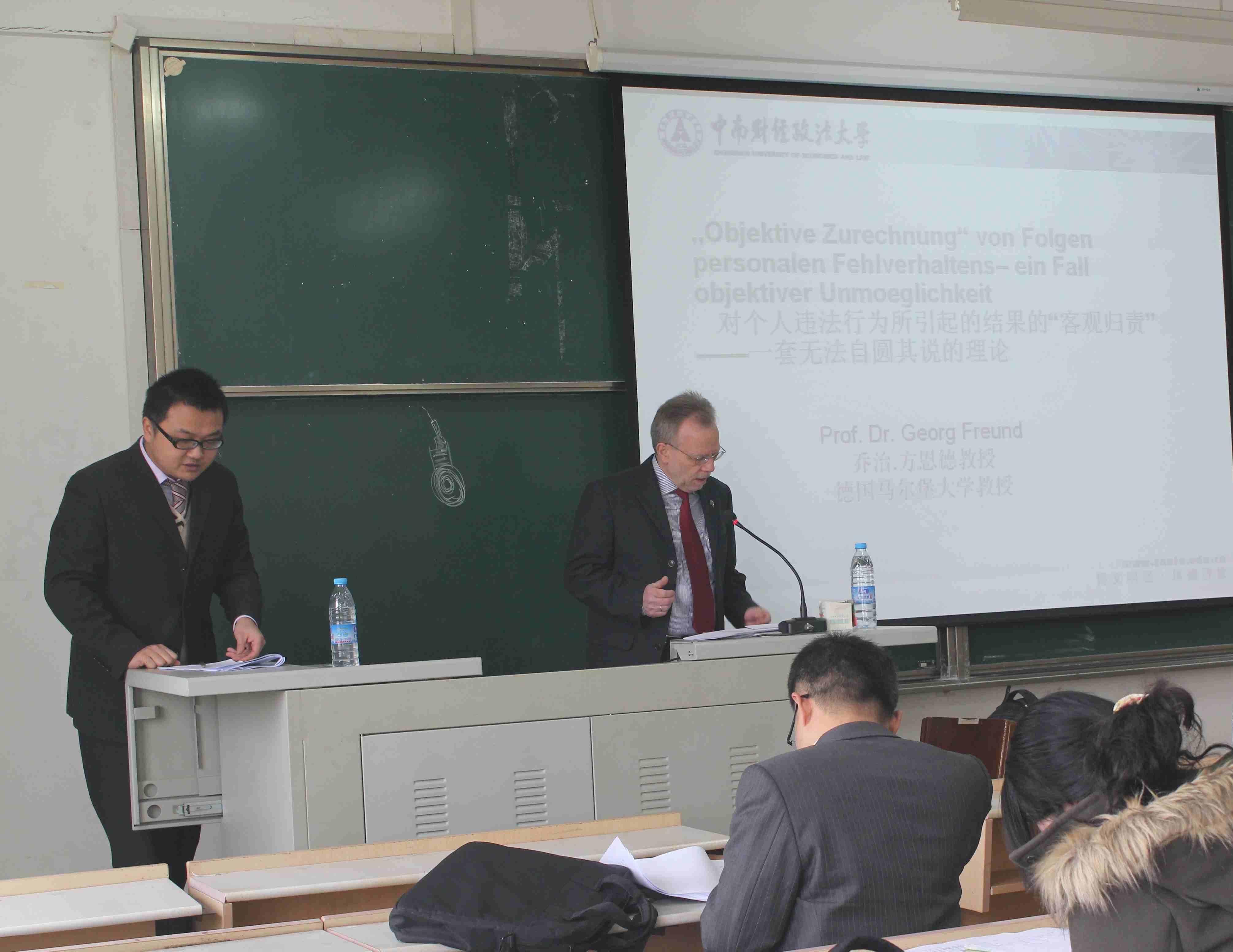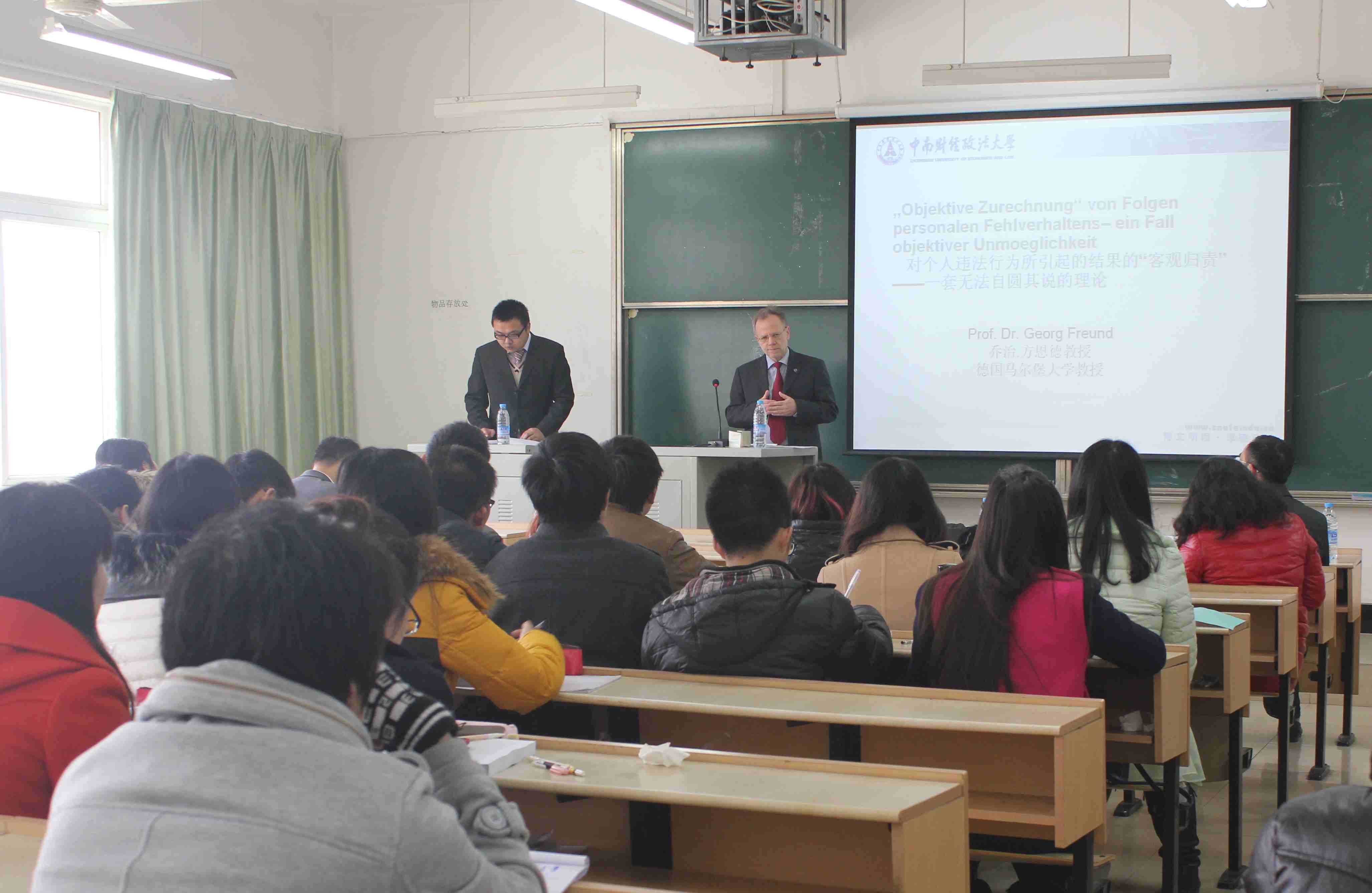 3月5日上午9点整,德国马尔堡大学Georg Freund教授在综合楼413教室为我院同学带来了一场主题为“对于个人违法行为所引起的结果的‘客观归责’——一套无法自圆其说的理论”的精彩讲座。我院副院长苏彩霞教授、副院长童德华教授、王安异副教授等老师出席了本次讲座。而来自德国马尔堡大学的张正宇先生担任此次讲座的翻译。