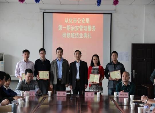 2015年4月21日星期二,广东省从化市公安局第一期治安管理警务研修班在文治楼会议室召开毕业典礼。会议由从化市公安局党委委员、指挥大队主任梁润生主持。从化市副市长、公安局局长刘岗、夏勇院长及39位警官学员出席了本次培训班结业典礼。