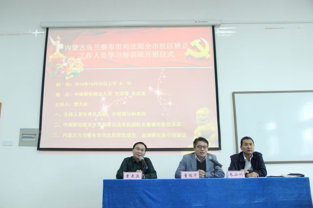 10月25日上午,内蒙古乌兰察布市司法局全市社区矫正骨干学习培训班在文清楼四楼会议室开班。内蒙古乌兰察布市司法局党组成员、副调研员朱小川同志、我院副院长童德华教授及乌兰察布市司法局各位领导同志们出席了本次开班仪式。仪式由我院培训中心主任曾大庆老师主持。