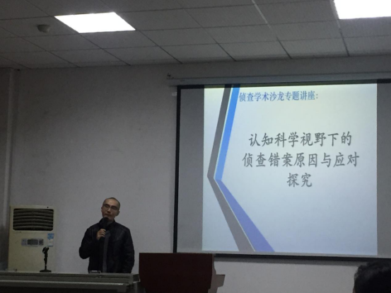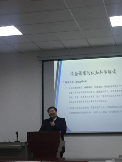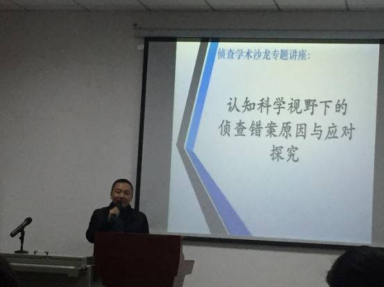 随后,周睦棋老师宣布学术沙龙活动正式开始,杨立云副教授在大家热烈的掌声中上台,讲述了“认知科学视野下的侦查错案原因与应对探究”的相关问题。杨立云副教授访美留学归来不久,他首先就在美国的见闻进行了介绍,语言生动幽默,内容引人入胜。杨立云老师说:“今天跟大家交流的这个题目是我所参与的一个教育部人文社科类项目中的研究问题,错案在当下社会引起广泛关注,且其本身影响很大,侦查机关在司法活动中有重要地位,因此对侦查错案的研究是一个好的切入点,也有理论和实践意义。”接着,杨立云老师分别介绍了什么是侦查错案、侦查错案原因的认知科学解读以及针对错因的应对,讲解层次清晰,理论明确,同学们纷纷表示获益匪浅。