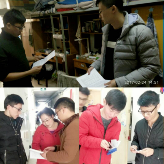 新学期新气象,彭老师希望借此机会了解同学们的到校情况及生活,及时帮助大家解答一些学习、生活上的疑惑,提出自己的经验建议供大家分享。彭老师和刘老师按个检查了每一间寝室,查看了宿舍的安全状况,并发给每个宿舍一份“大学生安全提示”,叮嘱大家注意自身安全。老师们还检查了同学们的寝室卫生,希望大家要注意保持寝室的干净整洁,以便为学习生活提供一个良好的环境,特别针对研究生三年级的学生,老师们就毕业论文还有就业问题认真的询问了同学。