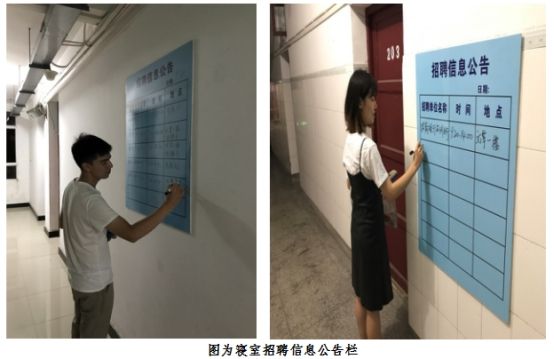 制作就业信息公告栏,张贴于我院毕业生宿舍每个楼层最醒目的位置,由专人每天负责更新就业信息,学生出入宿舍将对近期招聘单位何时何地举行招聘会一目了然。通过建立寝室招聘信息公告栏,将就业信息以最直观的方式发布给学生,拓展了就业信息传播渠道,同时为学生营造就业氛围。