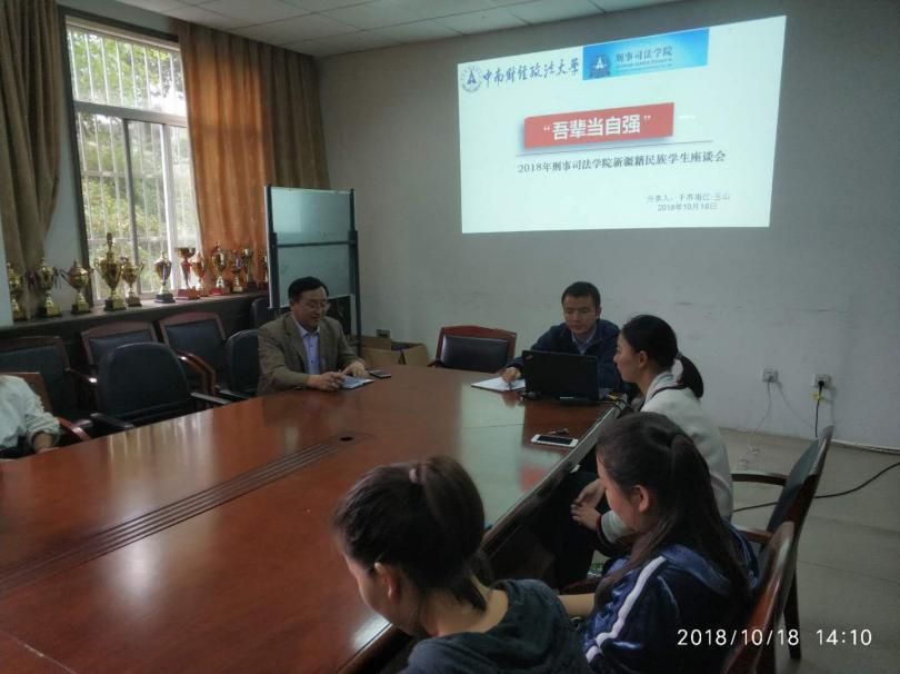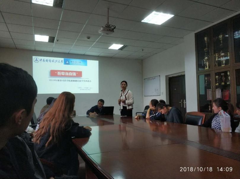 (新闻网讯 记者 田婷钰 摄影 依力牙斯江·阿地力)10月18日中午,“吾辈当自强”—2018年刑事司法学院新疆民族学生座谈会在文治一楼会议室顺利召开。刑事司法学院学生工作办公室主任陆薇、学工部少数民族专职辅导员于苏甫江·玉山(简称“于苏”)、新疆教育厅内派老师赛力克·吾山(简称“赛力克”)参加本次座谈会。