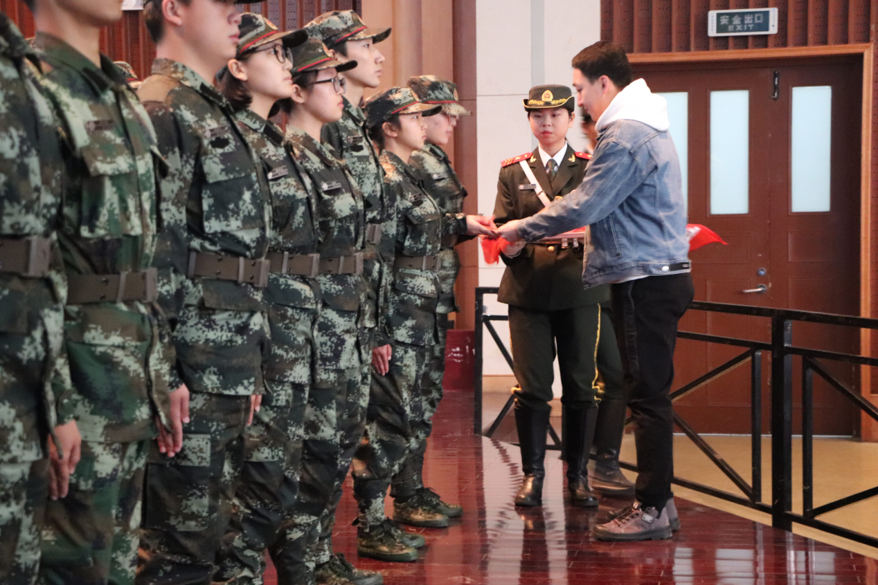 仪式在开场视频结束后正式开始。仪式第一项,全体起立,奏唱国歌。庄严的国歌过后,为表彰在集训期间表现优异的新队员,刑事司法学院党委副书记万里雪为五位新队员颁发了优秀证书。随后,国旗护卫队第十三届队长庞万腾为全体新队员颁发了队员证和臂章。紧接着,校团委宣传部以及中国地质大学(武汉)国旗班的代表也先后上台致辞,言语间既表达了对新队员的赞许,更是肯定了队伍长久以来的发展。