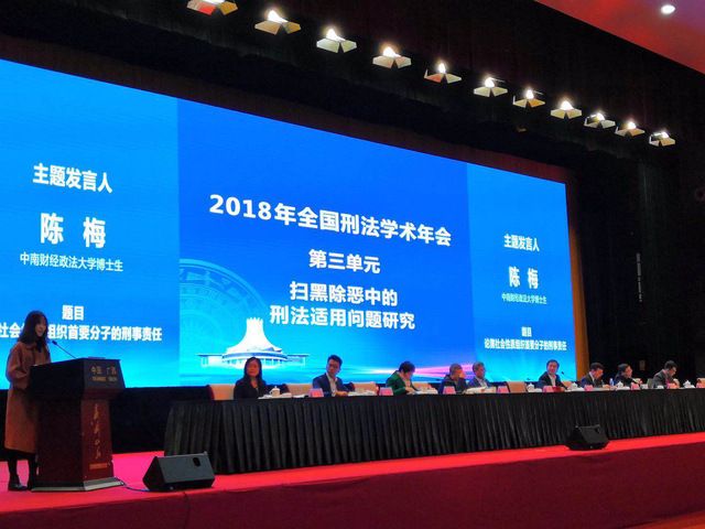 12月17日下午,在我院齐文远教授与中国刑法学研究会秘书长刘志伟教授共同主持的“扫黑除恶中的刑法适用问题研究”这一单元中,我院刑法学博士研究生陈梅作了题为《论黑社会性质组织首要分子的刑事责任》的主题发言。陈梅博士生从当前司法实践中黑社会性质组织首要分子刑事责任认定不一致的问题出发,就黑社会性质组织首要分子刑事责任的依据、范围与程度发表了自己的看法。
