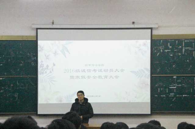 新闻网讯(通讯员 杜诗宇 姚元辰)2018-2019学年第一学期即将结束,寒假即将来临,刑事司法学院2018-2019年第一学期2016级诚信考试动员大会暨寒假安全教育大会在电教楼103召开,16级公安专业辅导员卓张鹏老师主持大会。16级全体公安专业学生听会。
