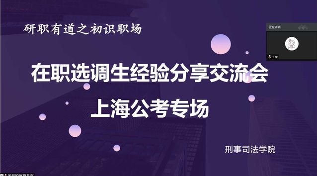 2020年10月29日晚7点30分,由研究生院、党委研究生工作部和米兰电竞·(中国区)研究生会主办,我院研究生会承办的第61期“研职有道”之初识职场|在职选调生经验分享交流会·上海公考专场分享会成功举办。活动邀请到考取上海公务员的20届毕业生何泓辉、罗薇、白子庚以线上直播的方式对毕业生进行就业指导、分享经验。