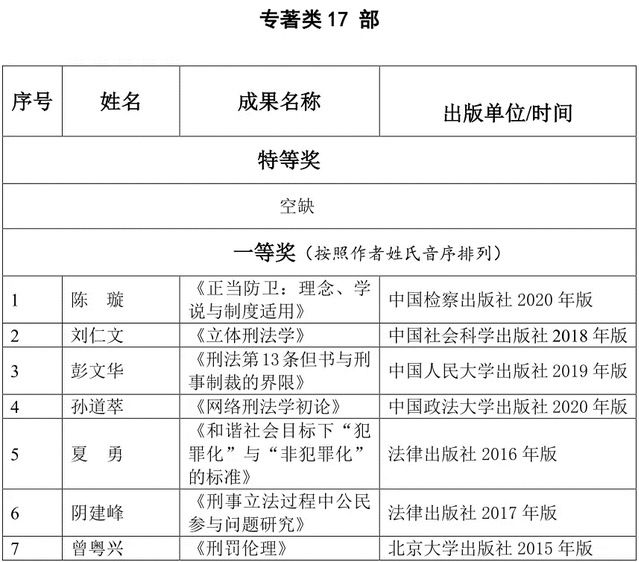 由中国刑法学研究会组织的第二届“全国刑法学优秀学术著作奖(2014-2020)”评奖活动,于 2021 年 7 月 1 日正式启动。截止 8 月15 日,共有来自全国高等院校、科研机构、实务机关和法律服务机构的 67 部著作参与申报。为了保证评奖的公平与公正,中国刑法学研究会特设立“第二届‘全国刑法学优秀学术著作奖’评审委员会”,评奖历经初评与终评两个阶段,已于 2021 年 9 月 26 日顺利完成。评委会会议严格遵循科学、公正和宁缺勿滥的原则,以无记名投票的方式评选出获奖著作 22 部(其中专著类特等奖空缺,一等奖 7 部,二等奖 10 部;优秀教材奖 5 部)我院夏勇教授在法律出版社出版的著作《和谐社会目标下“犯罪化”与“非犯罪化”的标准》获批一等奖。