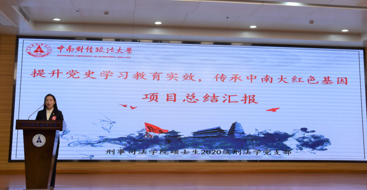 此次展评会由党委组织部、党委研究生工作部主办,经过前期的申报立项、支部组织实施、结项申报总结等环节,最终全校有16个党支部取得了参加本次成果展评会的资格。在展评环节,硕士生2020级刑法学党支部潘彦伊以学习党史、校史为切入点,通过对支部开展的参加升旗仪式、“齐诵经典,共读匠心”红色经典诗歌朗诵大会、“寻访红色史迹 传承红色基因”学习参观武汉革命博物馆、“学党史,研法治”党史故事我来讲、参观学习校史馆、七一百年建党日学习习近平总书记重要讲话、观影《1921》、开展暑期党史学习教育等一系列活动的实施过程、实施成效、特色创新、未来展望进行汇报,赢得了评委和观众的热烈掌声。所有支部汇报结束后,评委老师进行了精彩的点评,在对支部党建活动进行肯定的同时也指出了不足,2020级刑法学党支部定将充分学习,吸取经验,不断完善,争取以更优异的成绩,礼赞建党百年。