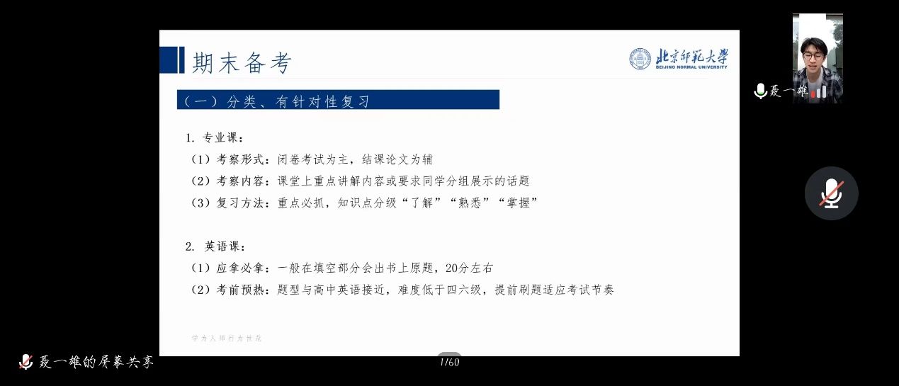 大会伊始,郭青川老师邀请到了2017级的优秀毕业生们分享他们的暑期经验与期末考试复习技巧。首先,陈卫洲师兄提到社科类学科学习的核心在于阅读理解、问题解决、语言表达,学习需以任务驱动分配时间,注重整块时间和零散时间的高效利用,张弛有度、功在平时,并向师弟师妹们的暑假规划提出了合理建议;第二位进行分享的是聂一雄师兄,聂师兄简洁明了地分享了考前的准备工作建议以及对于大学内竞赛的建议,同时要注重兴趣培养;最后分享的是燕永辉师兄,燕师兄强调了诚信考试的重要性和严肃性,告诫师弟师妹们不要铤而走险,而应认真对待,合理指定复习计划,同时也建议在暑假中丰富自身、提升自我。